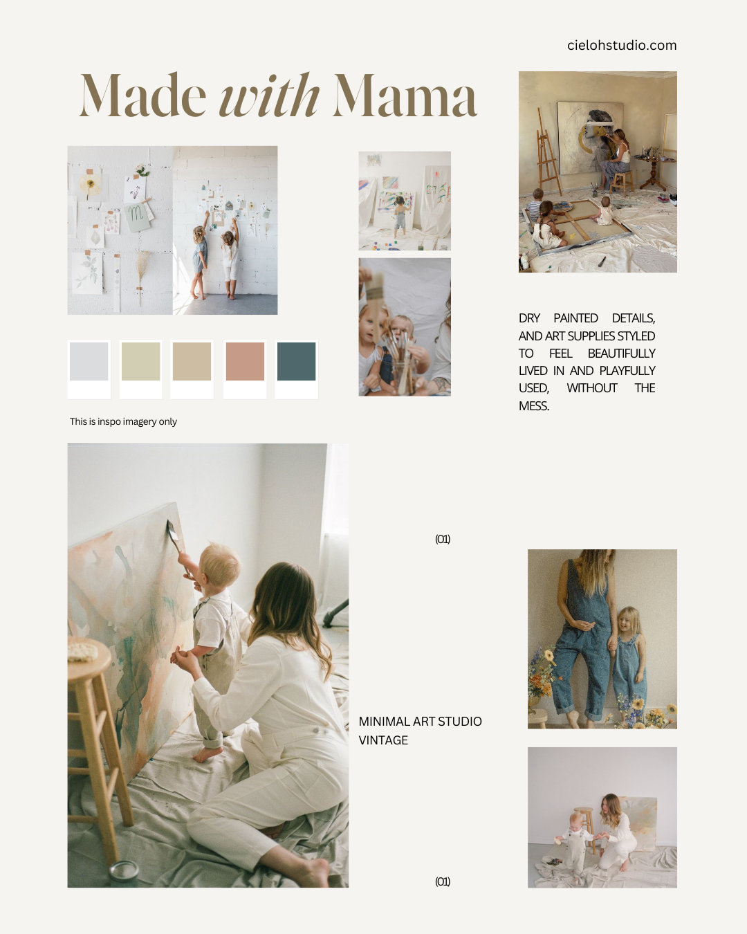 Made with Mama is a vintage inspired, minimalist art studio set created to capture connection, creativity, and the beauty of slowing down together. Designed with softly layered neutrals, worn textures, and thoughtfully curated art props, the space feels editorial yet totally playful!